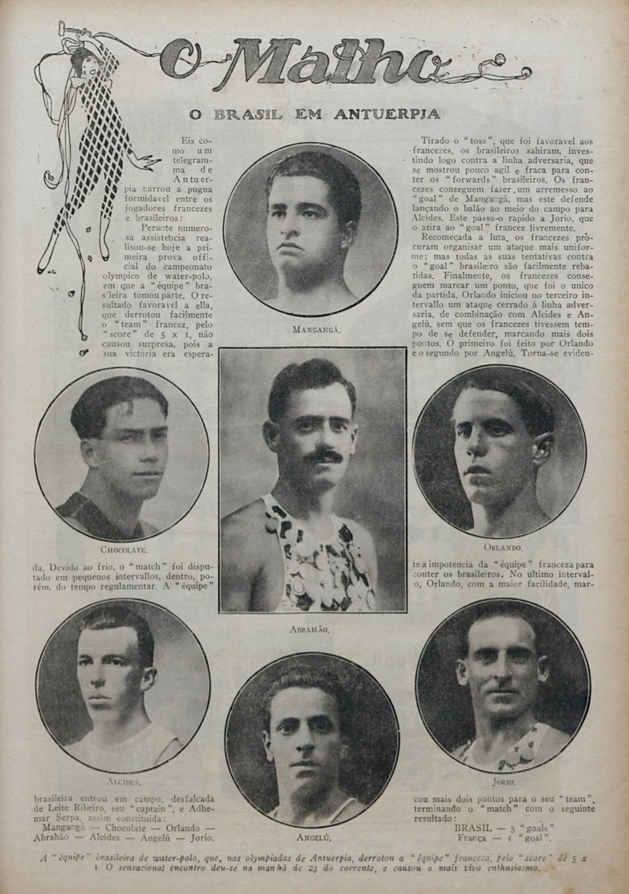 Matéria destaca a goleada de 5 a 1 da seleção brasileira de water polo sobre a equipe francesa. Em destaque nas fotos, os setes atletas do Brasil, vencedores da partida.